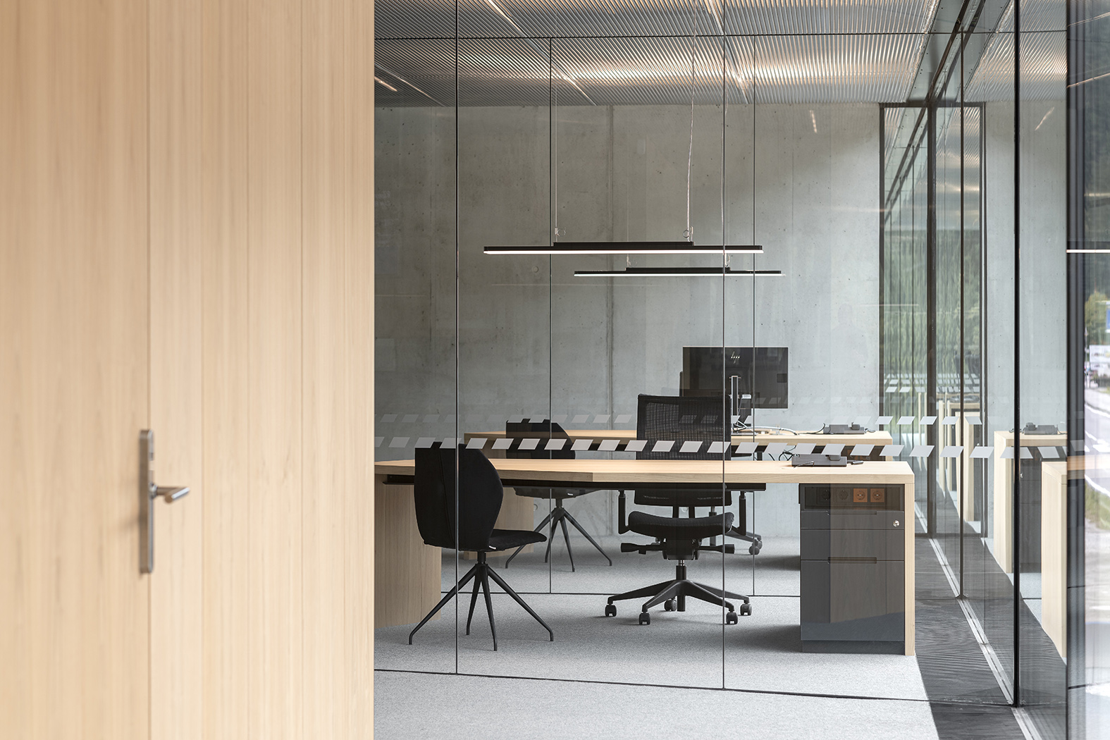 Der Kontext, geprägt durch Fels, Wald und die Enge des Tals wird, über die rahmenlosen Glasfassaden, ins Bürogeschoss geholt so wird dieses mit Umgebung (und Licht) geflutet. Nahezu alle Elemente wurden für das Projekt maßgeschneidert.